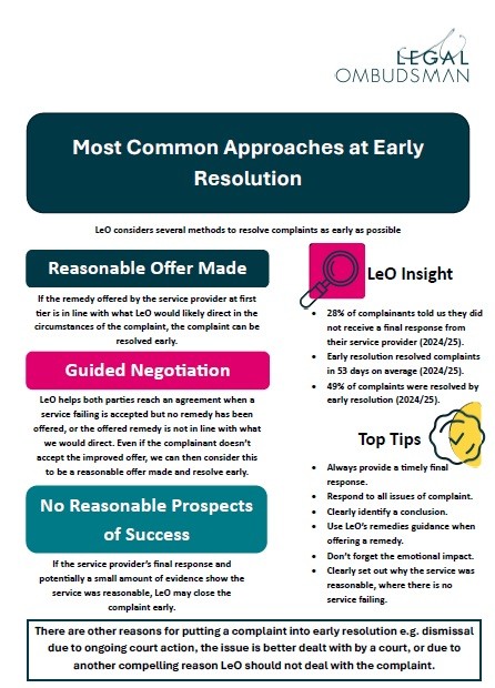 Good service, complaints handling and engagement with LeO quickens resolution Background Miss T instructed the service provider in respect of a property purchase. As is usual in conveyancing transactions, the service provider gave Miss T advice on the purchase in a report on title. However, she decided not to proceed with the purchase following advice on a clause relating to the title. Miss T raised concerns with the service provider, believing they could have advised of the issue sooner than they did. Complaints Miss T raised a number of issues with the service provider, in particular: The service provider delayed in providing advice on the clause; The service provider delayed in sharing responses to enquiries; and That the service provider tried to mislead her into paying additional costs. The service provider gave a clear, and timely, response to Miss T’s complaint. They also explained why the approach they had taken was in line with standard procedures and processes. The Legal Ombudsman’s view and approach We reviewed Miss T’s complaint on receipt and noted that the service provider had provided advice on the clause, and the responses to the enquiries in their report on title. On the basis that it is standard practice for service providers to provide advice on issues that affect a title in their report on title, we took the view that there was no unreasonable delay and the complaint was unlikely to be upheld and therefore lacked any reasonable prospects of success. We also considered that it was reasonable for the service provider to offer to do extra work to resolve the issue, should Miss T want to continue with the purchase, she was not therefore misled into paying any additional fees. As the service provided was demonstrably reasonable, the complaint was dismissed by an Ombudsman at early resolution. As the complaint was dealt with at early resolution, no case fee was payable. LeO Insights If LeO can establish that the service provided was reasonable, or in line with standard practice from the information provided in the complaint and final response, the complaint may be suitable for early resolution. At early resolution, LeO may request one or two pieces of evidence to support a conclusion that we are unlikely to uphold a complaint and can therefore dismiss as having no reasonable prospects of success. Promptly providing this information increases the chances of early resolution.