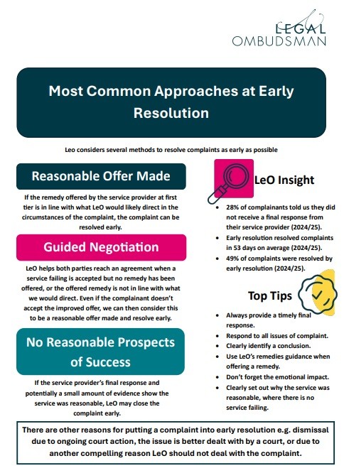 Good service, complaints handling and engagement with LeO quickens resolution Background Miss T instructed the service provider in respect of a property purchase. As is usual in conveyancing transactions, the service provider gave Miss T advice on the purchase in a report on title. However, she decided not to proceed with the purchase following advice on a clause relating to the title. Miss T raised concerns with the service provider, believing they could have advised of the issue sooner than they did. Complaints Miss T raised a number of issues with the service provider, in particular: The service provider delayed in providing advice on the clause; The service provider delayed in sharing responses to enquiries; and That the service provider tried to mislead her into paying additional costs. The service provider gave a clear, and timely, response to Miss T’s complaint. They also explained why the approach they had taken was in line with standard procedures and processes. The Legal Ombudsman’s view and approach We reviewed Miss T’s complaint on receipt and noted that the service provider had provided advice on the clause, and the responses to the enquiries in their report on title. On the basis that it is standard practice for service providers to provide advice on issues that affect a title in their report on title, we took the view that there was no unreasonable delay and the complaint was unlikely to be upheld and therefore lacked any reasonable prospects of success. We also considered that it was reasonable for the service provider to offer to do extra work to resolve the issue, should Miss T want to continue with the purchase, she was not therefore misled into paying any additional fees. As the service provided was demonstrably reasonable, the complaint was dismissed by an Ombudsman at early resolution. As the complaint was dealt with at early resolution, no case fee was payable. LeO Insights If LeO can establish that the service provided was reasonable, or in line with standard practice from the information provided in the complaint and final response, the complaint may be suitable for early resolution. At early resolution, LeO may request one or two pieces of evidence to support a conclusion that we are unlikely to uphold a complaint and can therefore dismiss as having no reasonable prospects of success. Promptly providing this information increases the chances of early resolution.
